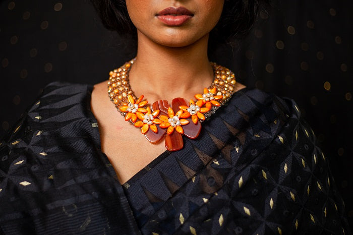 - A statement neckpiece like no other ,this exquisite creation is for the one who embarks on a journey unique from the rest. Be it on dresses or your sarees, this neckpiece is surely have few heads turn