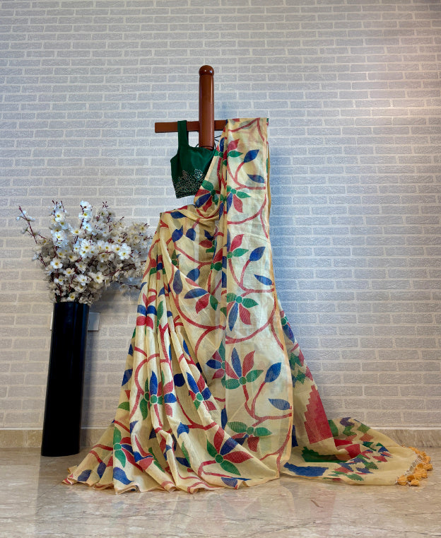 Inspired by our Jamdani sarees, we designed this exuberant saree that was dipped in soil water to hold the beautiful colours and fill the canvas of our imagination with the beautiful motifs.